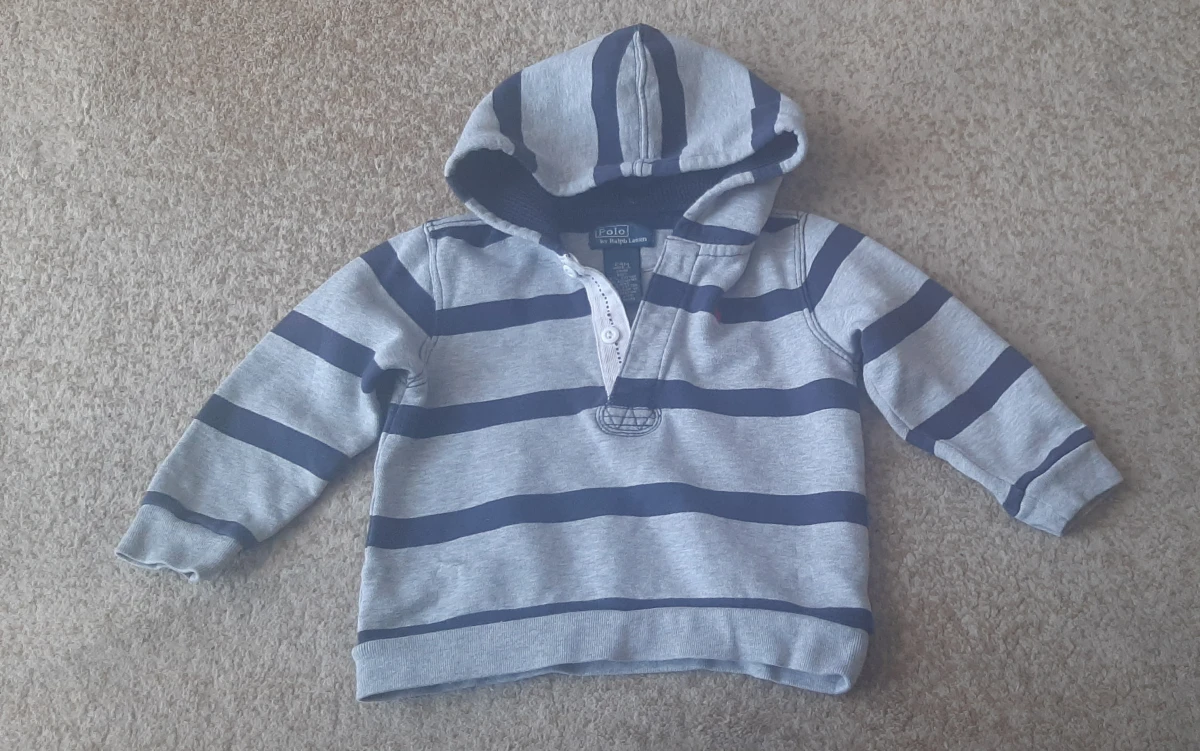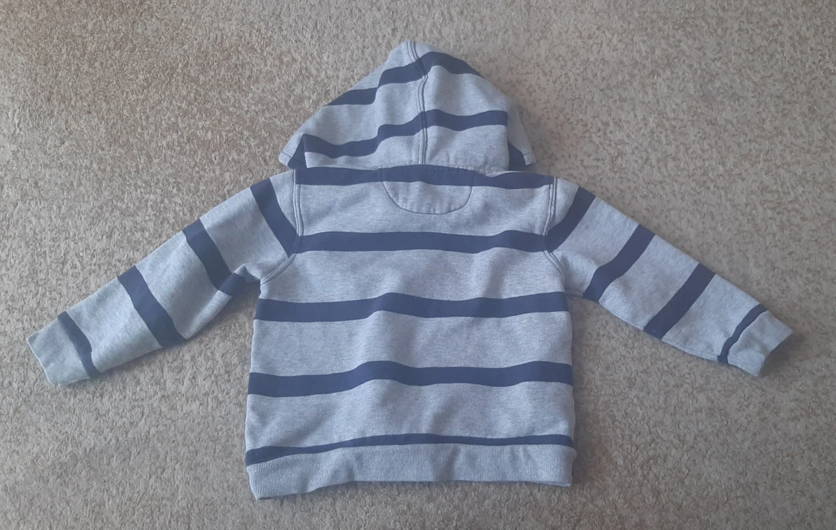 Bluza dresowa chłopięca, rozmiar 24m. W szaro-granatowe paski. Z kapturem. W bardzo dobrym stanie. Nie zmechacona. Skład: 87% bawełna i 13% poliester/ z zewnątrz; 100% bawełna/ od wewnątrz.