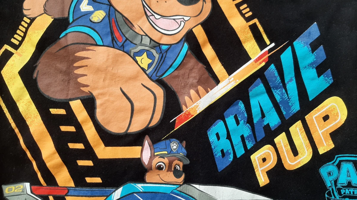 Koszulka w dobrym stanie. Materiał czarny w bardzo dobrym stanie, miły i przyjemny w dotyku. W aplikacji popękane jest autko. Po przybliżeniu zdjęć widoczne. Obrazek na bluzeczce ładny, wyraźny. 100% bawełna.