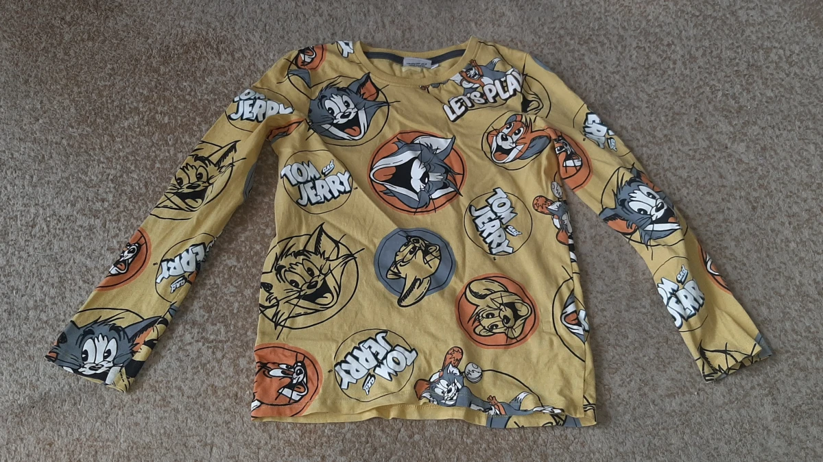 Koszulka/bluzka chłopięca 134. Rozmiar prawidłowy. Długi rękaw. W bardzo dobrym stanie. Kolory nie sprane, aplikacja nie popękana. Bez plam, bez uszkodzeń materiału. Kolor żółty odzwierciedla zdjęcie 2. 100% bawełna.