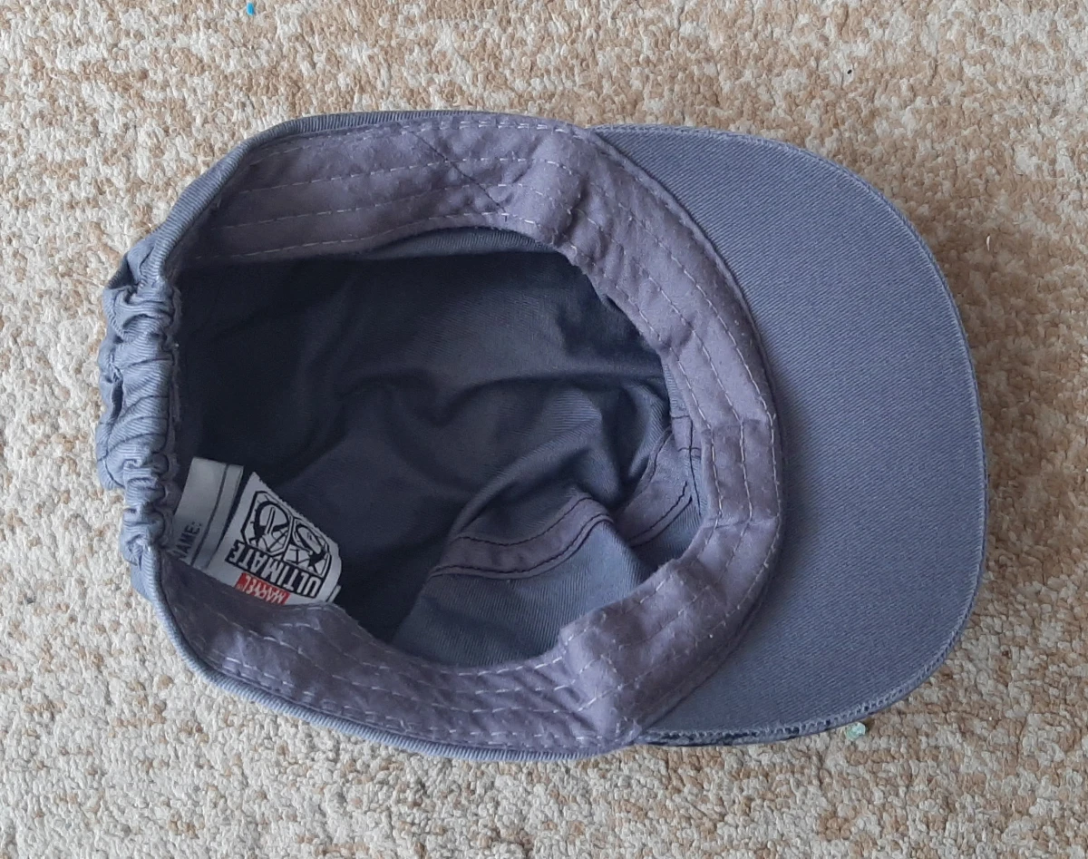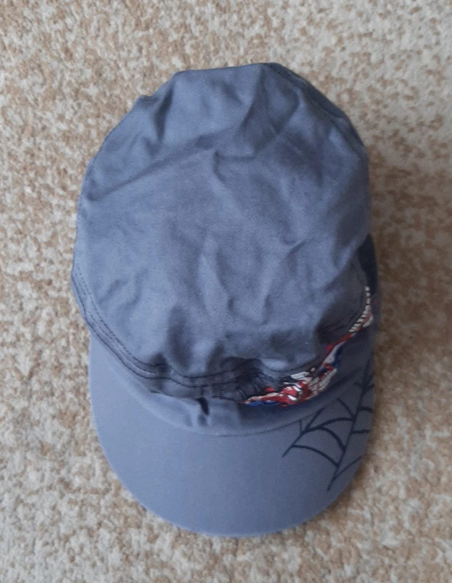 Czapka z daszkiem chłopięca Spiderman, roz. z metki 54. Typu military lub trekkingowa. Bez regulacji, ale gumka z tyłu. Kolor ciemnoszary. Aplikacja w idealnym stanie. Używana. Cała czapka stan idealny. Obwód czapki po naciągnięciu 54cm. 100% bawełna. Marka Marvel.