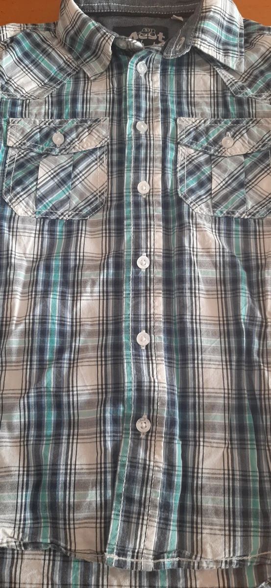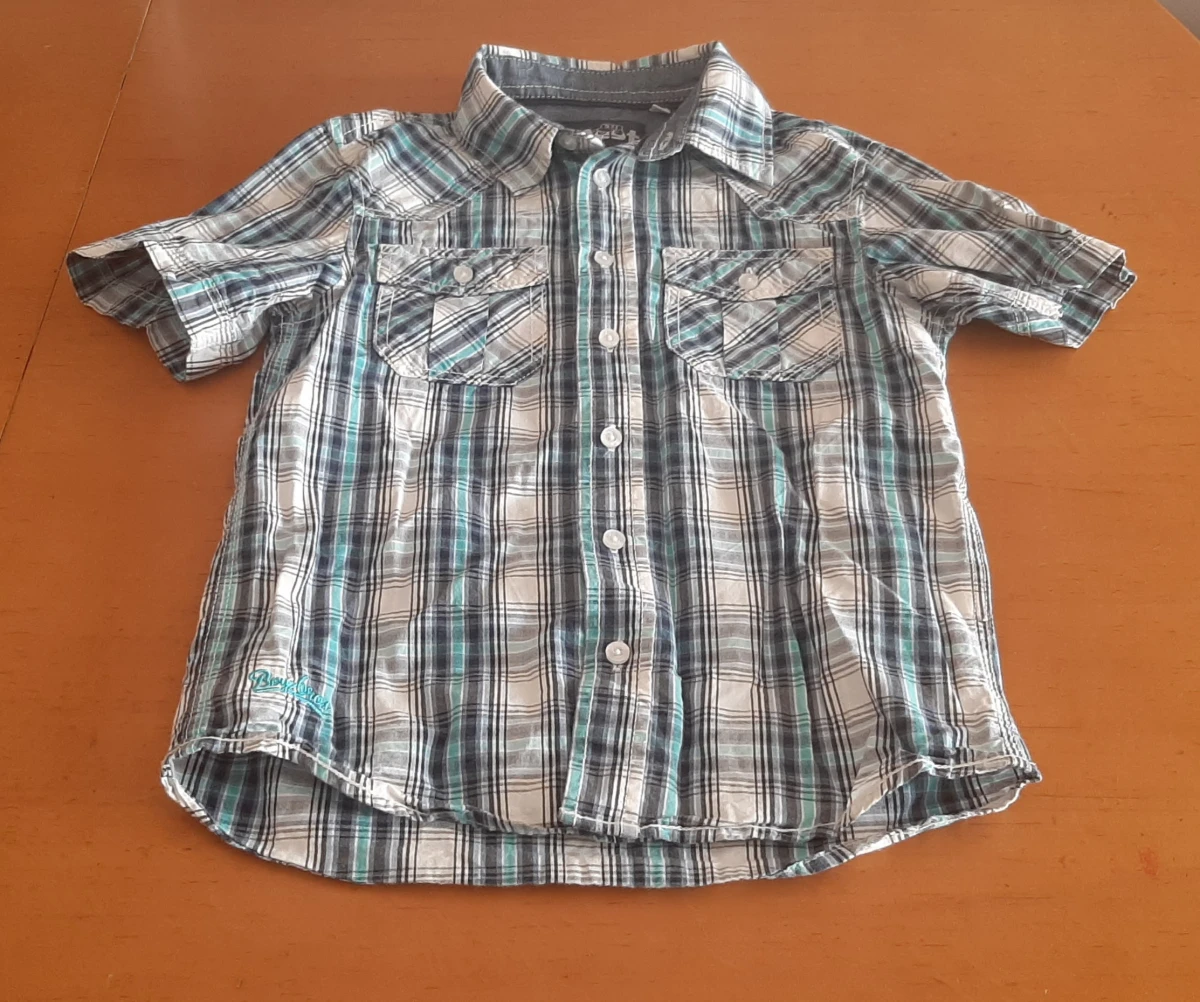 Koszula chłopięca w kratkę z krótkim rękawem. Rozmiar 122. W bardzo dobrym stanie. Posiada wszystkie guziki - logowane. 100% bawełna.