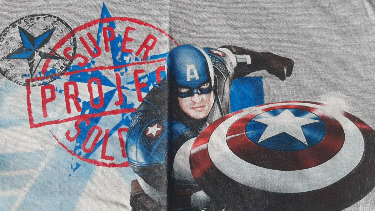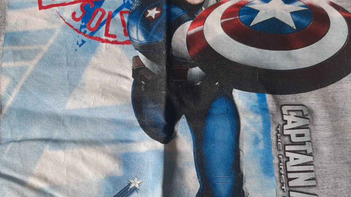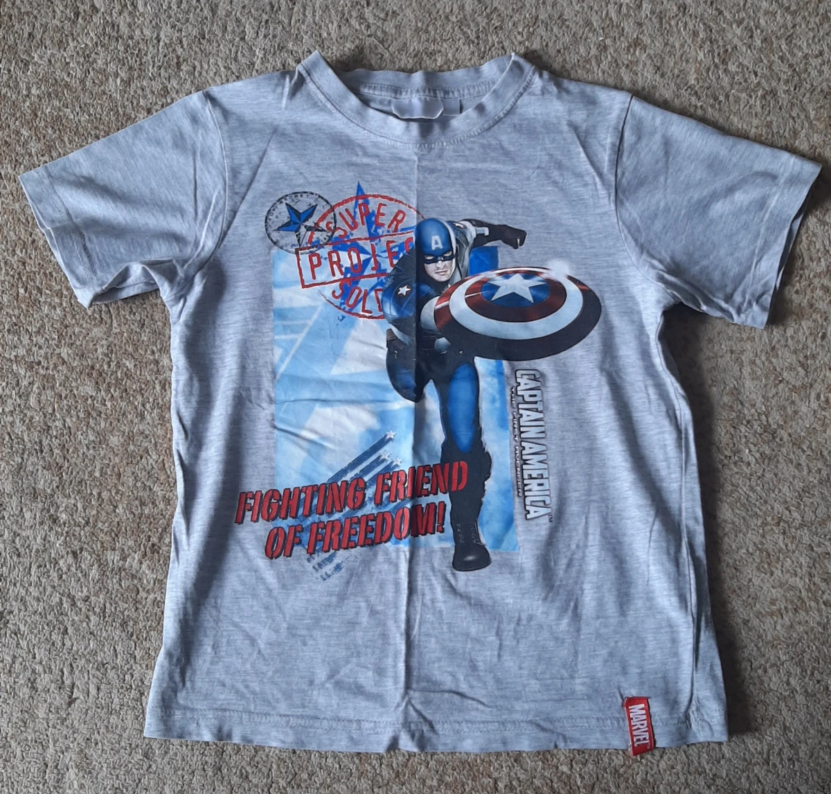 Roz.128. Koszulka w ogólnym stanie bardzo dobrym. Jednak aplikacja ma kilka pęknięć, nie są bardzo widoczne; ale są. Szwy boczne troszkę przesunięte. Skład: 95% bawełna i 5% wiskoza. Daję stan dobry, posłuży jeszcze do szkoły.