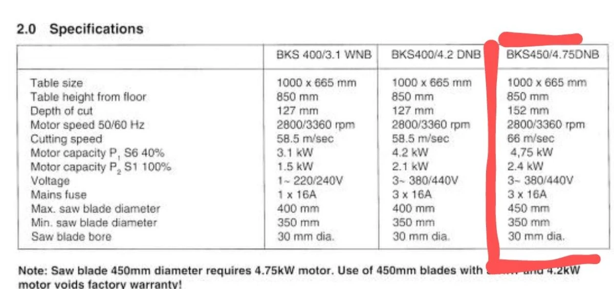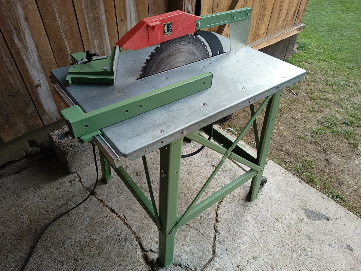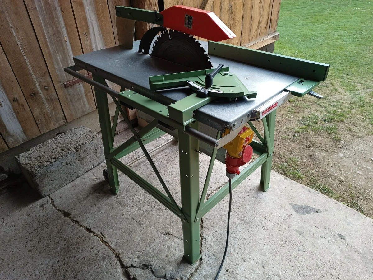 Fabryczna piła niemieckiej firmy Elektra Beckum (obecnie Metabo). Sztywna i stabilna. Wykonana z grubego materiału. Silnik na siłę 380/400 volt o mocy 4,75 kW (dokładne parametry na jednym ze zdjęć). Wtyczka 16 amper z 5 bolcami. Kompletna. Posiada osłonę górną tarczy, klin rozszczepiający, prowadnice wzdłużną/boczną z regulacją kąta i opcją szybkiego docinania klinów szalunkowych. Maksymalna tarcza jaką można założyć to 450 mm średnicy i wystaje 15 cm ponad stół.