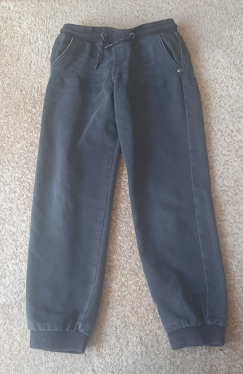 Spodnie chłopięce typu dżinsy. Nogawki zakończone ściągaczem. Rozmiar z metki 140, ale syn chodził, gdy miał 134. W bardzo dobrym stanie. W pasie gumka i sznurek. Jak najbardziej do szkoły. Skład: 64% bawełna, 35% poliester, 1% elastan. Marka Pepperts.