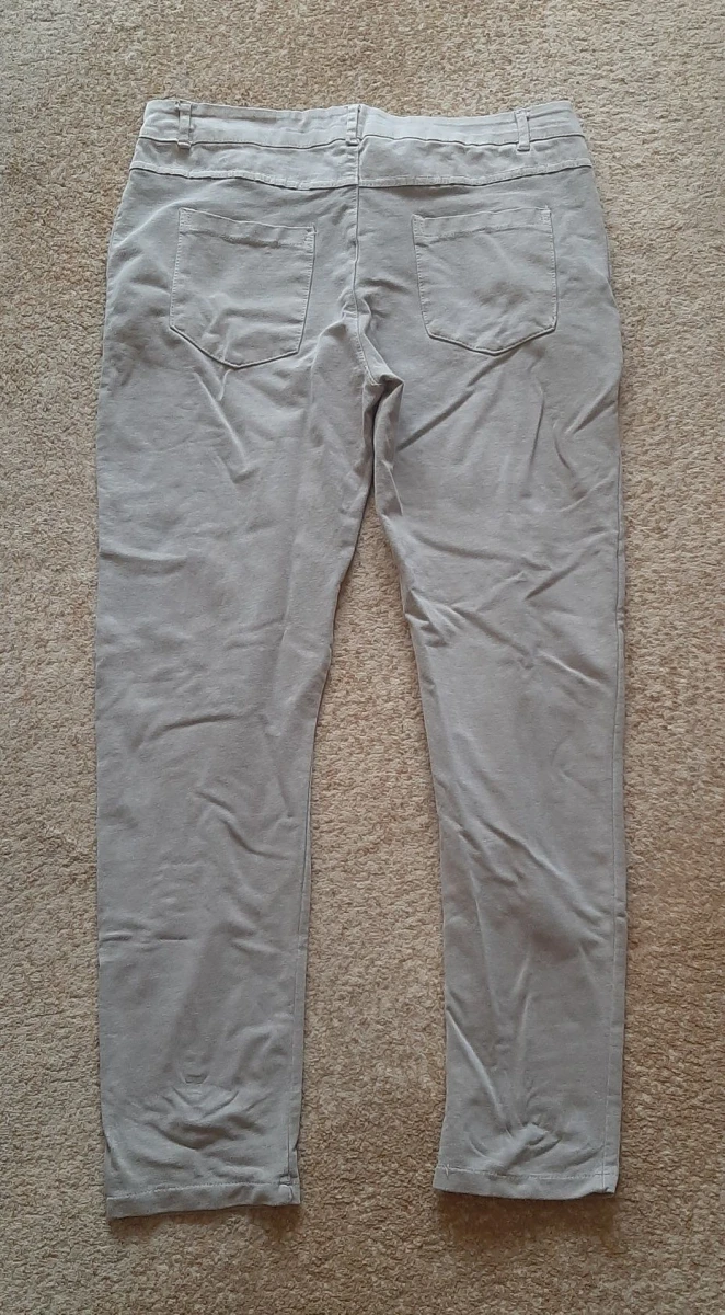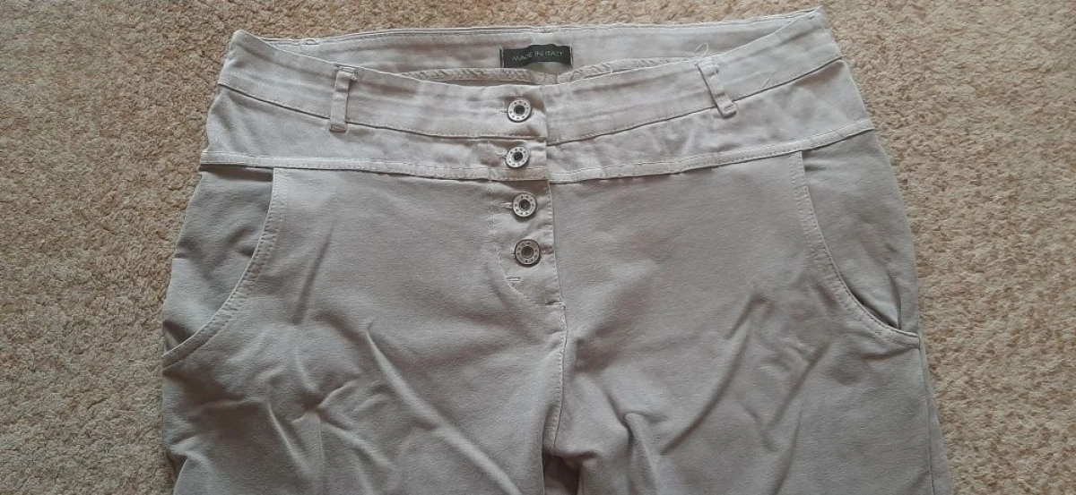 Spodnie damskie materiałowe. Bawełna elastyczna, przypominająca gumę. Cienkie, ale troszkę grubsze od legginsów. Spodnie typu rurki ale luźniejsze. W bardzo dobrym stanie. Co widać na zdjęciach w kroku i nogawki dołem. Skład: 95% bawełna i 5% elastan. Brak metki z rozmiarem. Marka Made i Italy.