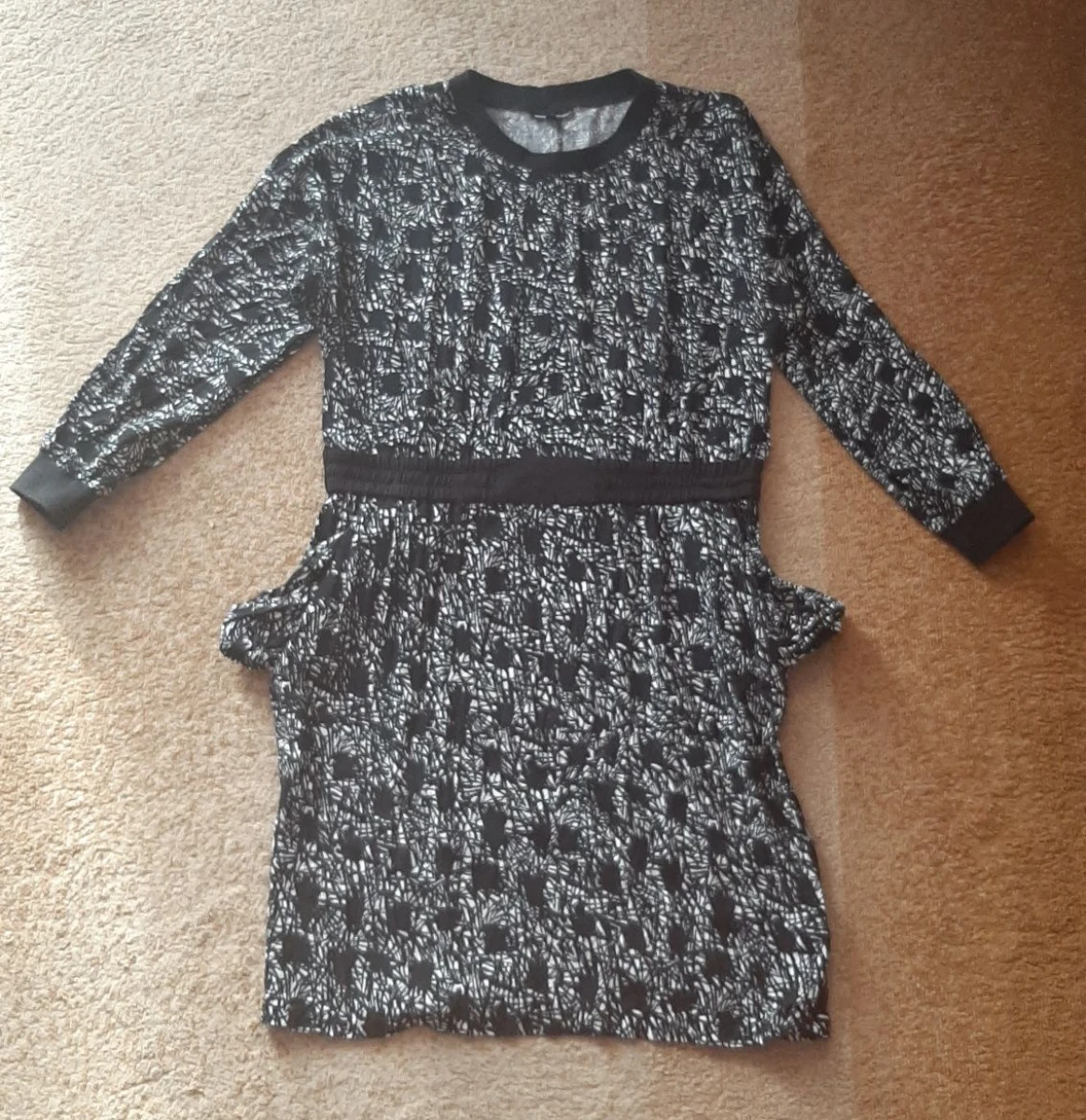 Sukienka w kolorze biało-czarnym. Rękawy ze ściągaczami. Posiada 2 kieszenie. 100% wiskoza. Marka Warehouse.