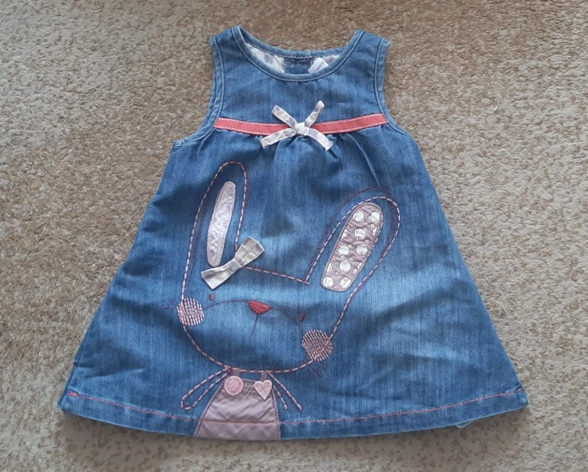 Sukienka dziewczęca dżinsowa, na szelkach, w bardzo dobrym stanie. Na przodzie wyszyty króliczek/zajączek. Z tyłu zapinana na guziki i dołem falbanka. Skład: 55% bawełna i 45% poliester. Wyprodukowano w Chinach.