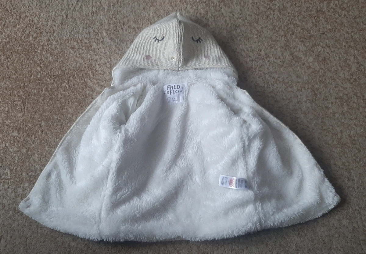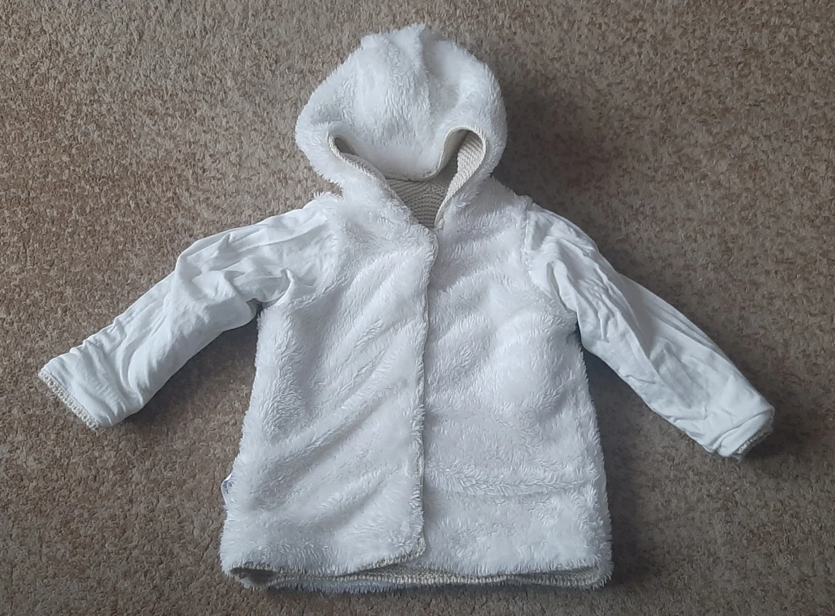 Sweter dziewczęcy zapinany na guziki. Z kapturem. Ocieplony futerkiem - bardzo mięciutkie. Kolor beżowy ze złotą nitką. Rozmiar 6-9m. Zdj.6 od wewnątrz. Skład: z zewnątrz 86% bawełna, 7% poliester, 4% włókno metaliczne, 3% nylon; od wewnątrz rękawy 100% bawełna, futerko 100% poliester.