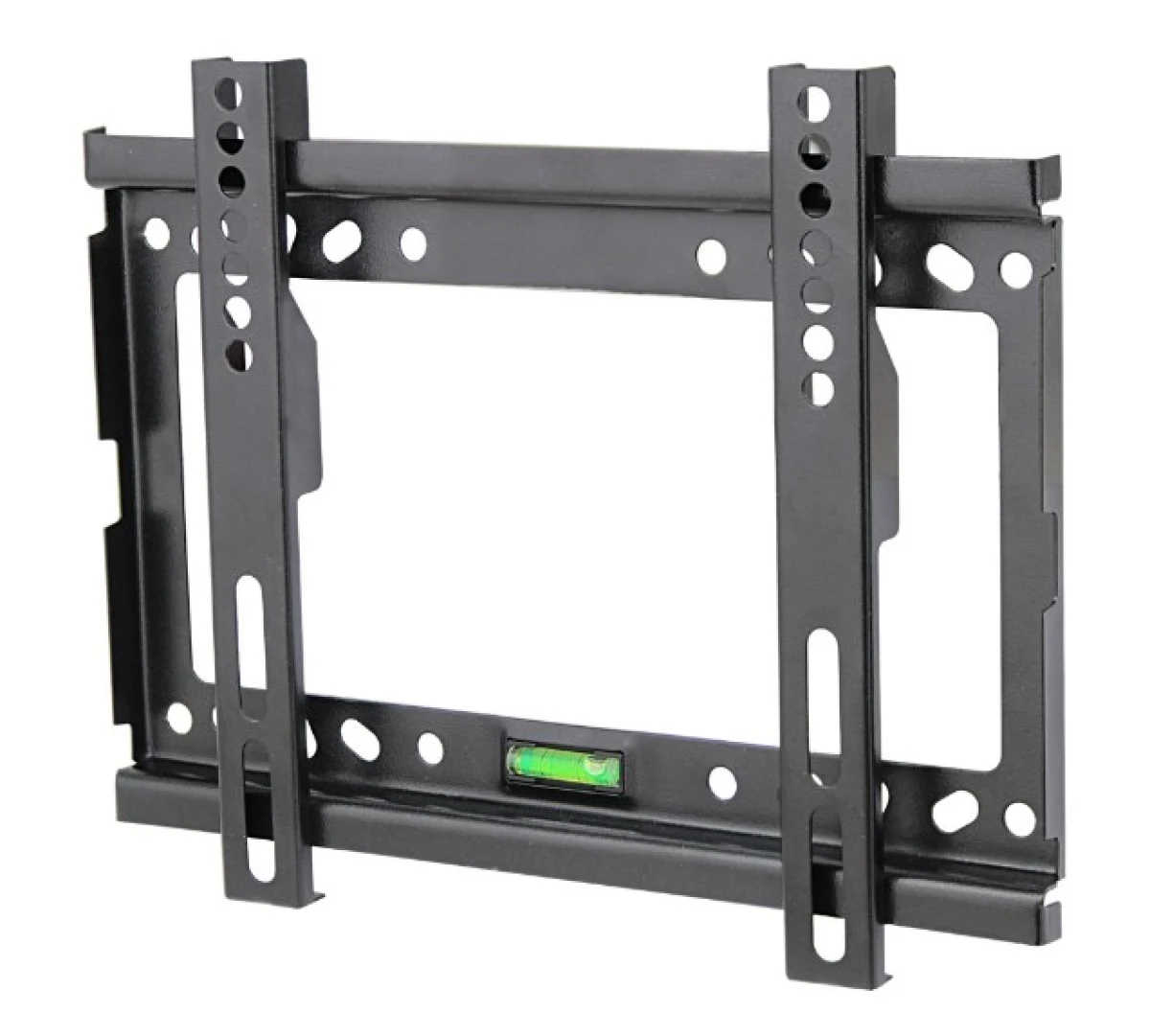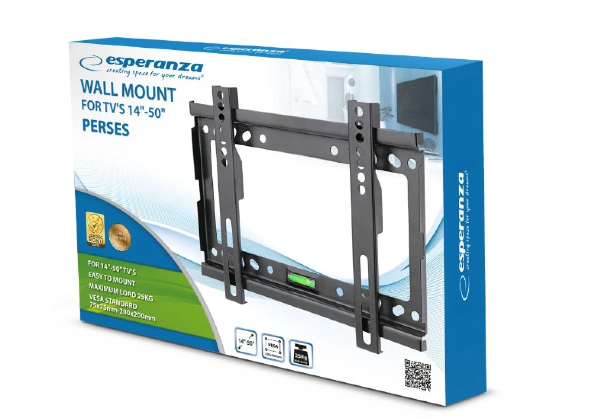 Metalowy, mocny uchwyt naścienny do telewizorów w rozmiarze od 14” do 50”. Łatwy w montażu. Zgodny ze standardem VESA 75x75 – 200x200. Posiada w zestawie małą poziomicę ułatwiająca wypoziomowanie uchwytu.
