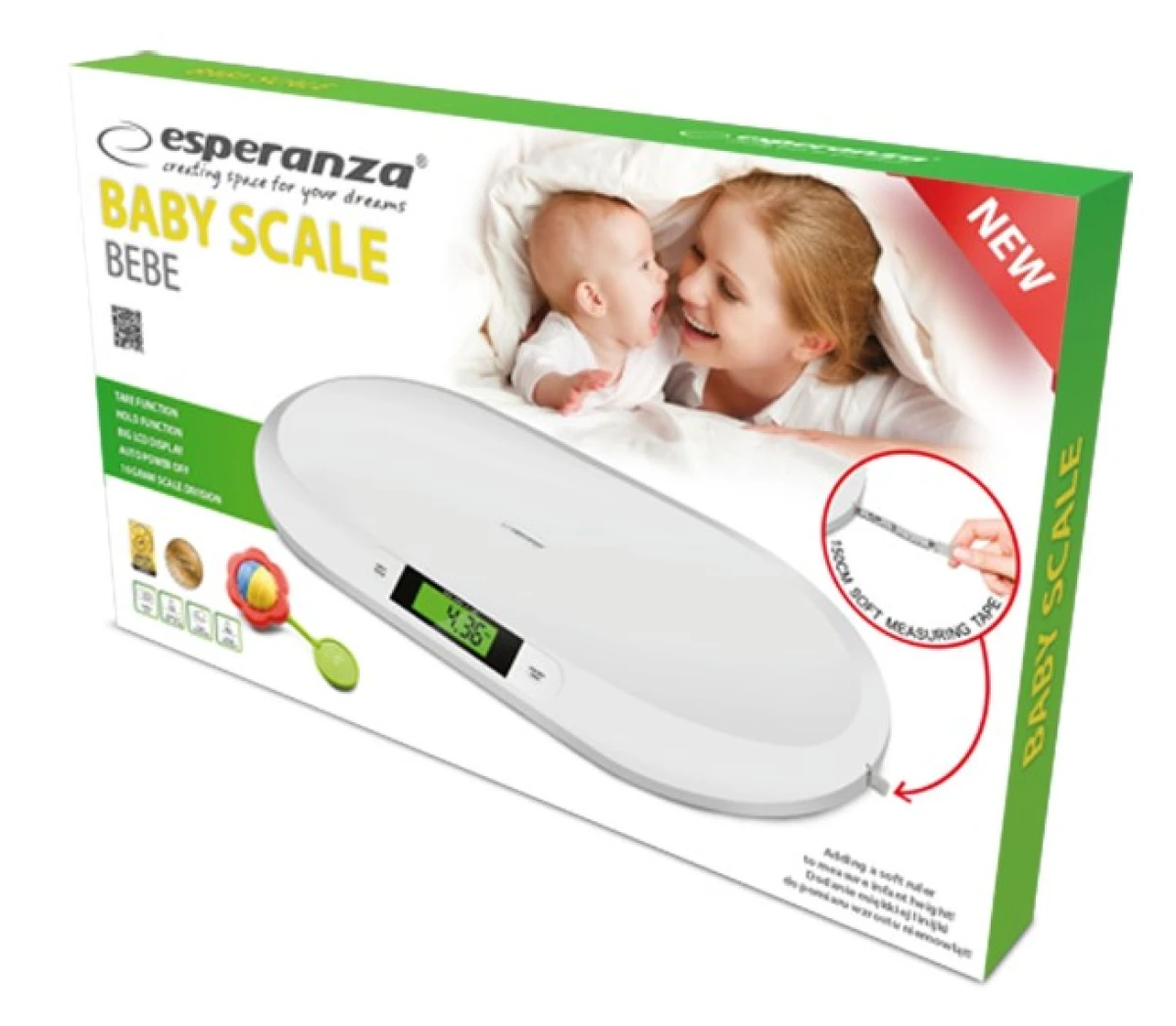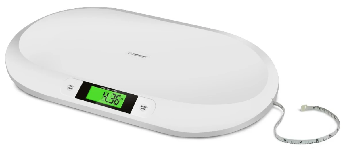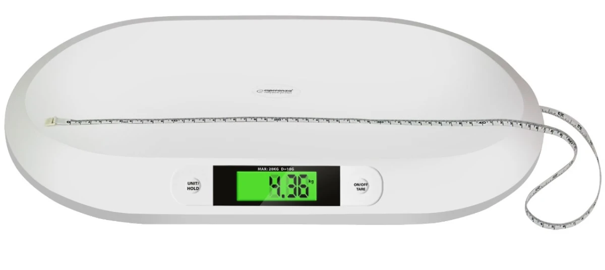 Czytelny wyświetlacz wyświetlacz ciekłokrystaliczny ułatwia odczytywanie wskazań. Urządzenie posiada funkcję tarowania oraz funkcję HOLD ułatwiającą zważenie ruchliwego niemowlęcia. Ergonomiczny kształt wagi zapewnia dziecku wygodę i bezpieczeństwo podczas ważenia. Waga dla niemowląt Esperanza, to najlepszy sposób, aby monitorować rozwój i zdrowie dziecka.