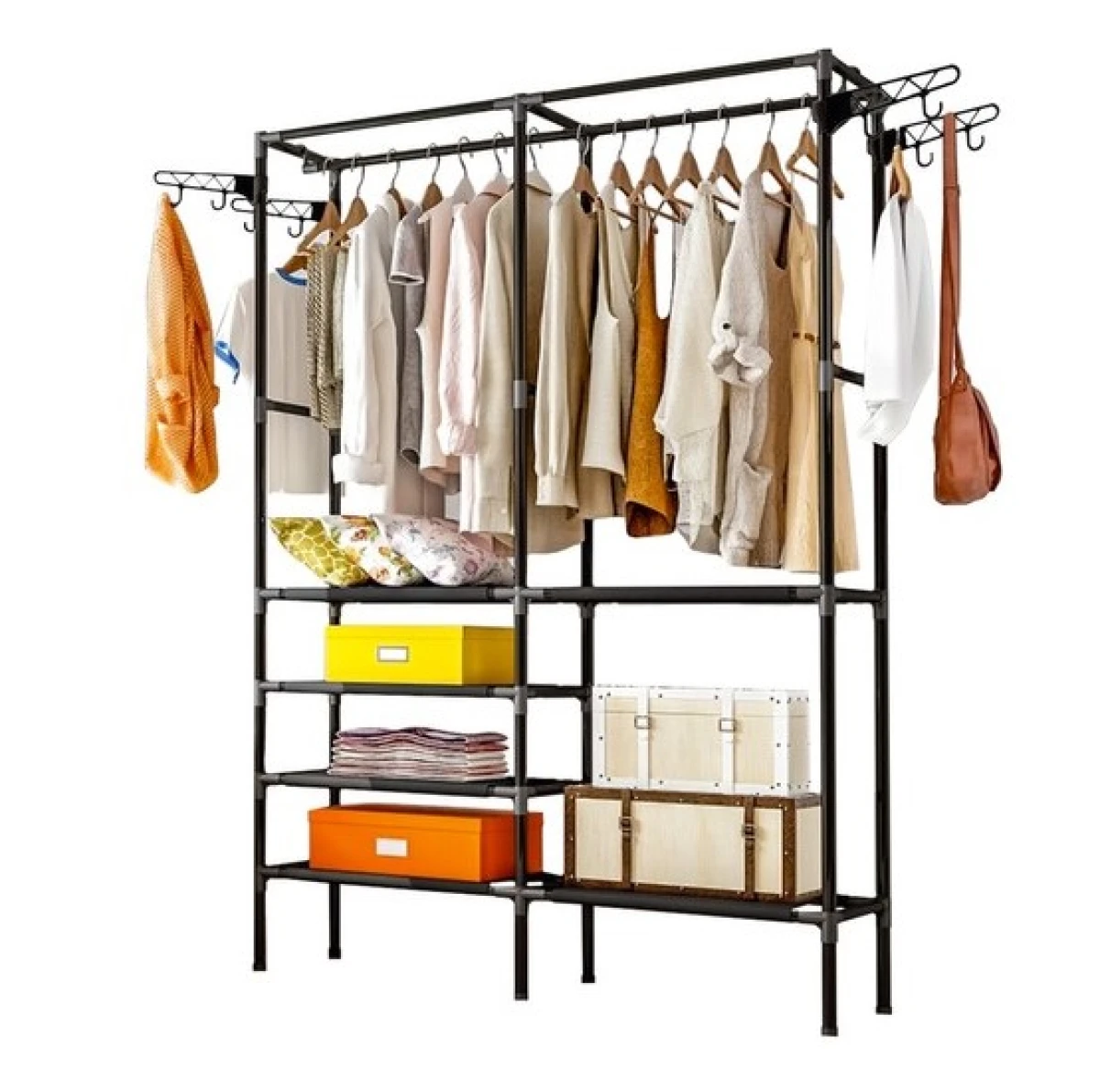 - OSZCZĘDZA MIEJSCE - wieszak jest doskonałym rozwiązaniem dla tych, którzy mają ograniczoną przestrzeń lub tymczasowy mebel w domu. Wieszak jest lekki i dostosowywana do różnych pomieszczeń. Posiada 6 półek, 2 drążki do wieszania oraz 8 wieszaków.