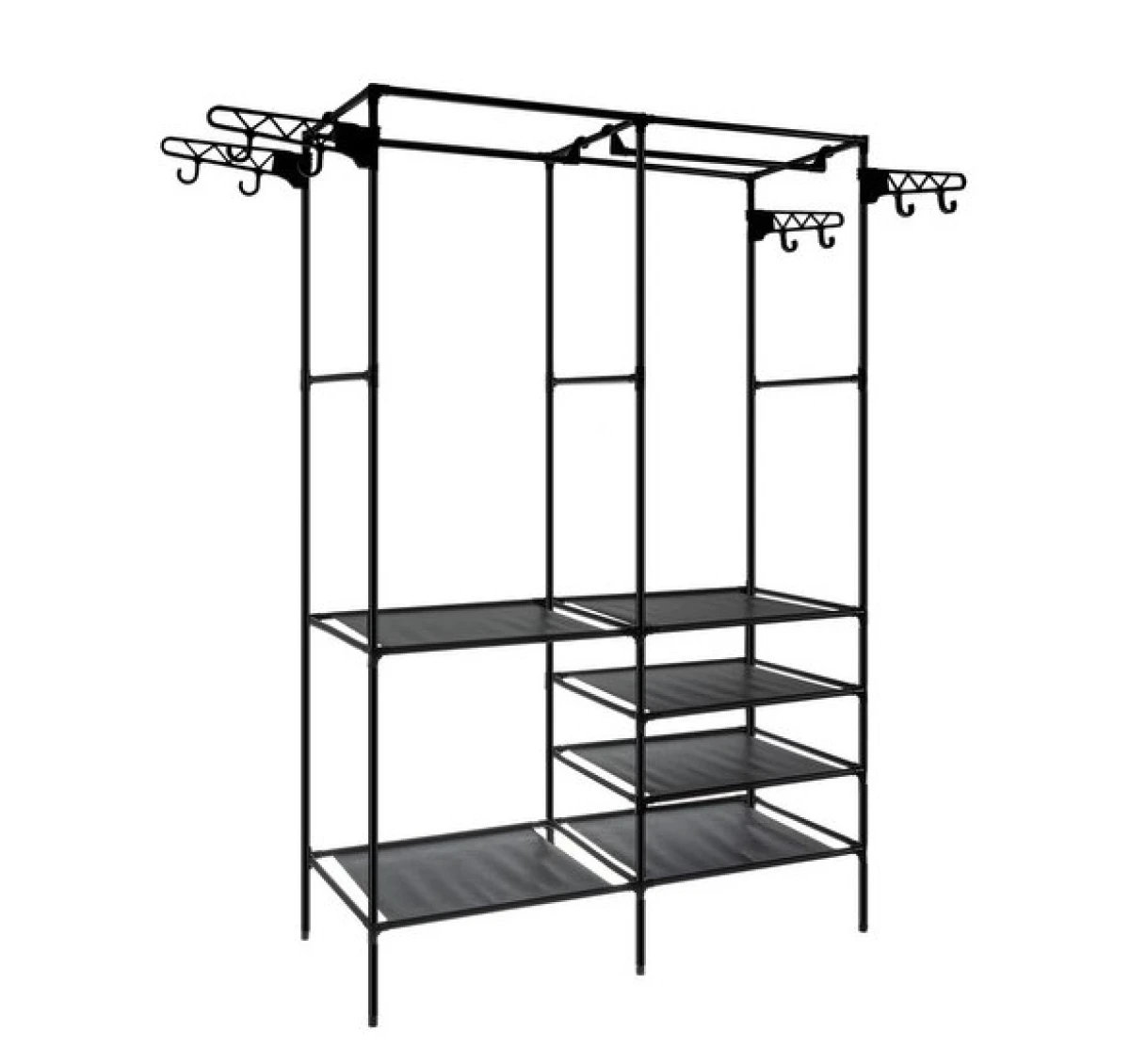 - SPECYFIKACJA - kolor: czarny; materiał: tworzywo sztuczne + metal; ilość półek: 6; ilość drążków do wieszania: 2; ilość bocznych wieszaków 8; wymiar: 173 x 36 x 108 cm; waga: 4,5 kg; waga w opakowaniu: 4,9 kg.